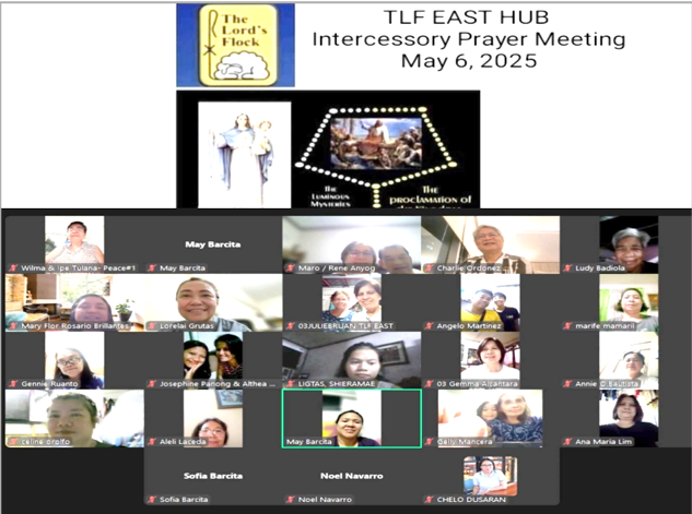 The Lord’s Flock Catholic Charismatic Community-East Hub conducted their monthly virtual Intercessory Prayer Meeting for the month of May 2025. Participants included chapter’s Advisers, Stewards and members who lifted their personal and group prayers through the intercession of Blessed Virgin Mary.  Indeed, their prayer devotion emphasized that when two or more believers agree in prayer, “God who is present will answer their requests” (Mt. 18: 19-20).